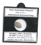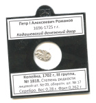 1 копейка KG# 1922 (Регулярный выпуск) (KG# 1922) 1702. В холдере. Петр I Алексеевич Романов 1696—1725 гг. Кадашевский денежный двор. Серебро. Вес 0,28 г