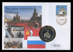 3 рубля — 750-летие Победы Александра Невского на Чудском озере. Нумизматический конверт, выпущенный в Германии и посвященный денежной реформе в России начала 1990-х годов. Немецкая надпись на конверте «Die neue russische Währung» («Новая российская валют