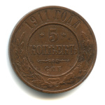 В центре указан номинал «5», ограниченный с обеих сторон цветочными розетками. Под цифрой номинала слово — «КОПЕЕК», под ним год выпуска монеты «1863.». Ниже, расположен декоративный разделитель в виде двух фигурных линий и небольшой точки между ними. Под разделителем обозначение монетного двора «Е.М.».По окружности, вдоль канта, декоративный венок вверху, внизу, справа и слева крестообразно перехваченный лентами.