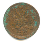 Монета регулярного выпуска: 5 копеек 1863 года «Орел 1859 г». 5 копеек 1849 — 1867 гг. Российская Империя: Александр II (1855 — 1881). Монетный двор: Екатеринбургская монета, г. Екатеринбург. Медь, 26 г, ø 36−36 мм, Гурт: Гладкий. Тираж: 22510720 шт.