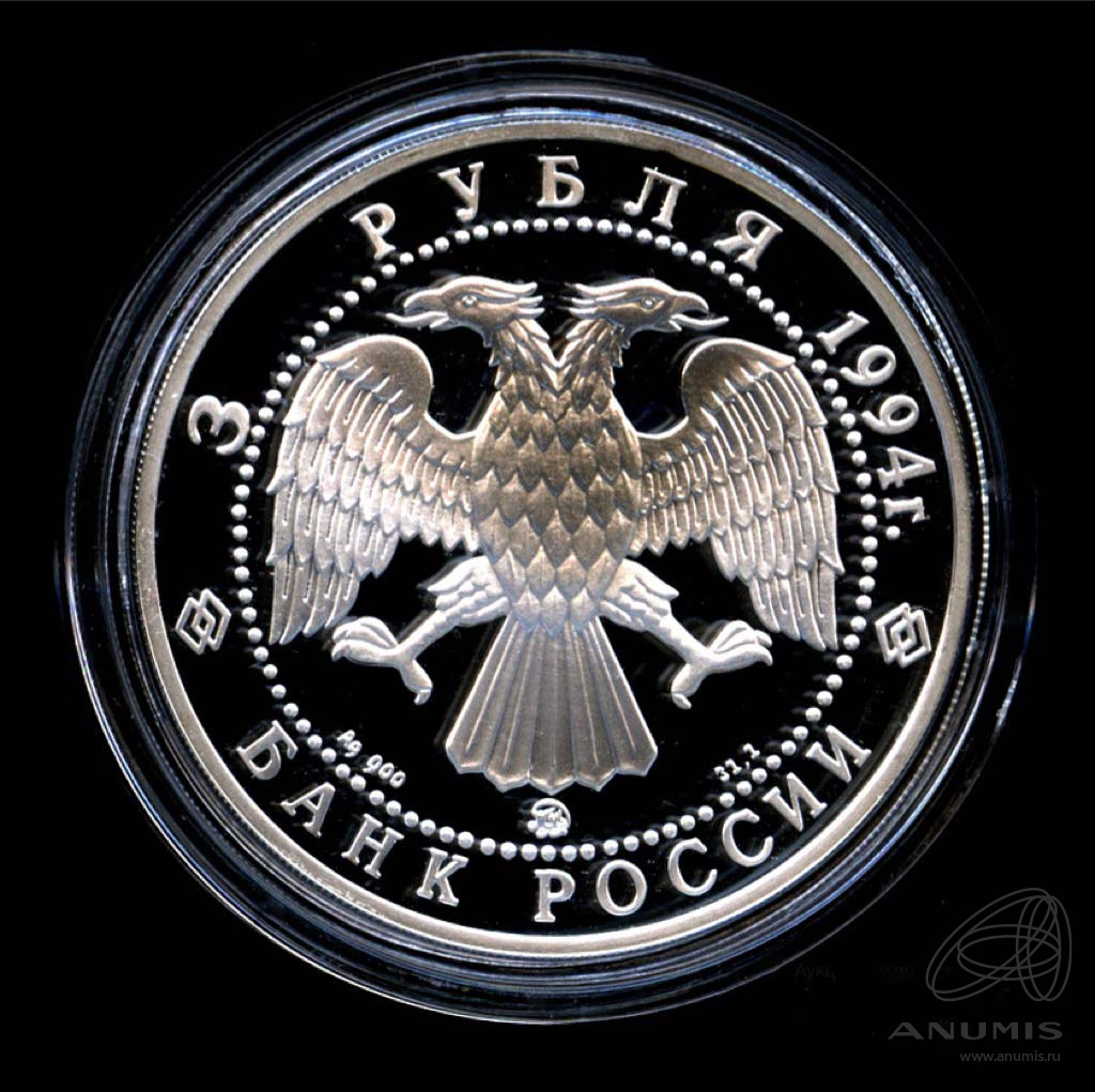 изображение двуглавого орла (художник И. Билибин), по кругу надписи: вверху — «3 РУБЛЯ 1994 г.», внизу — «БАНК РОССИИ». В нижней части — обозначение металла, проба сплава, товарный знак монетного двора и содержание драгоценного металла в чистоте.
