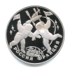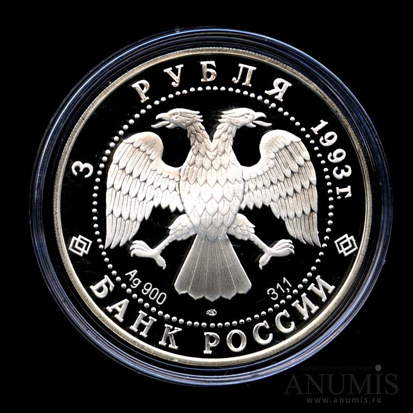 в центре диска — эмблема Банка России (двуглавый орёл художника И. Билибина), под ним: слева — обозначение металла, проба сплава, в центре — товарный знак монетного двора, справа — содержание драгоценного металла в чистоте. По окружности надписи, обрамлённые кругом из точек: вверху — «3 РУБЛЯ 1993 г.», внизу — «БАНК РОССИИ».Реверс