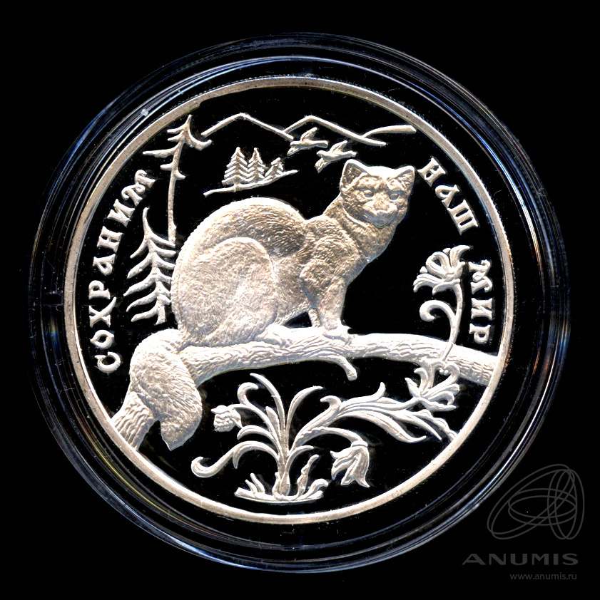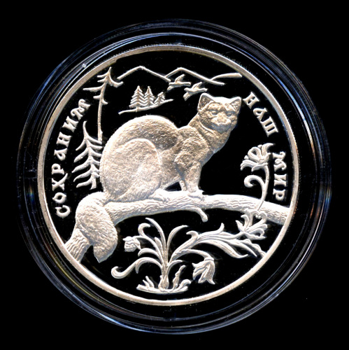 Юбилейная монета: 3 рубля 1994 года «Соболь». Сохраним наш мир. Российская Федерация: Банк России (1992 — 1996). Монетный двор: Московский монетный двор, г. Москва. Серебро 900, 34 г, ø 39 мм, Гурт: Рубчатый. Каталожный номер: 5111−0019. Тираж: 10000 шт. Серия: Сохраним наш мир.