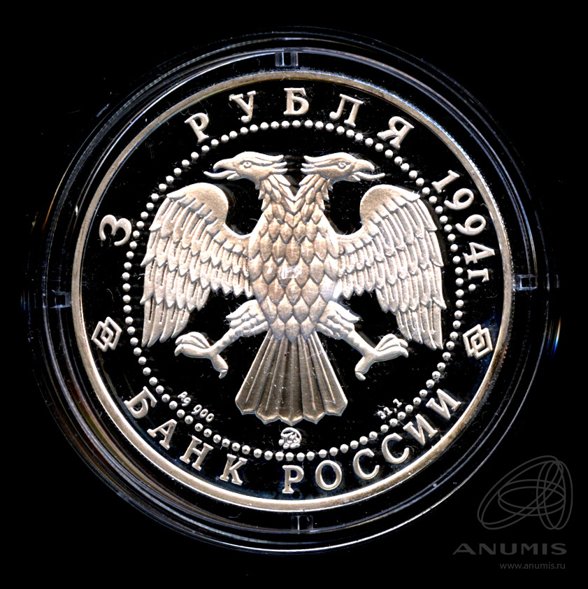 изображение двуглавого орла (художник И. Билибин), по кругу надписи: вверху — «3 РУБЛЯ 1994 г.», внизу — «БАНК РОССИИ». В нижней части — обозначение металла, проба сплава, товарный знак монетного двора и содержание драгоценного металла в чистоте.Реверс
