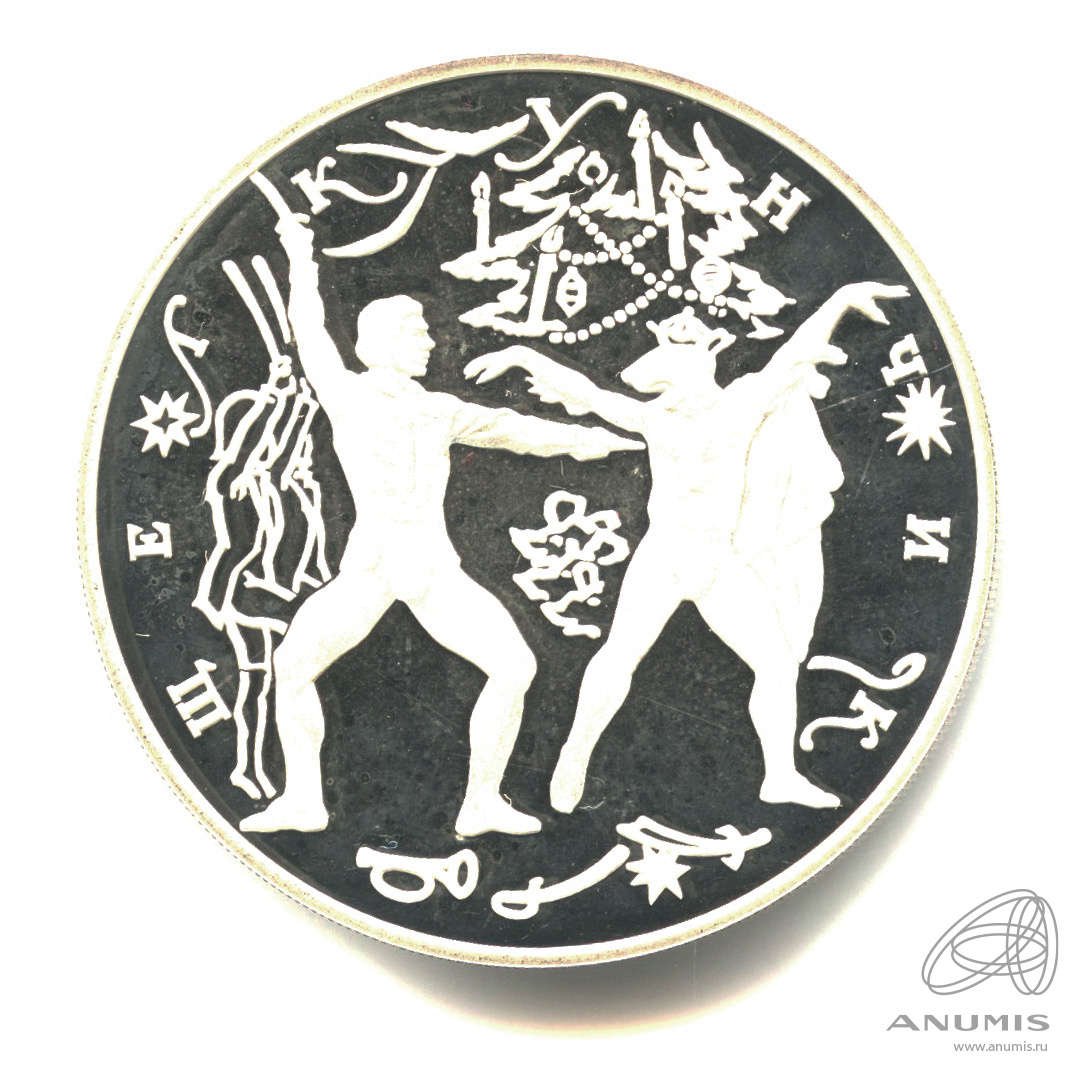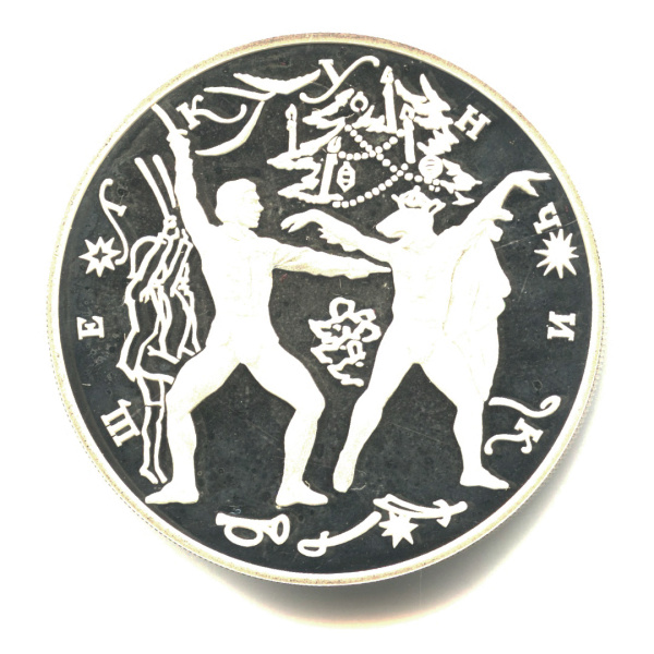 Юбилейная монета: 3 рубля 1996 года «Щелкунчик. Поединок». Русский балет. Российская Федерация: Банк России (1992 — 1996). Серебро 900, 34 г, ø 39 мм, Гурт: Рубчатый. Тираж: 25000 шт. Серия: Русский балет.