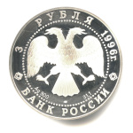 изображение двуглавого орла (художник И. Билибин), по кругу надписи: вверху — «3 РУБЛЯ 1996», внизу — «БАНК РОССИИ». В нижней части — обозначение металла, проба сплава, содержание драгоценного металла в чистоте и товарный знак монетного двора.