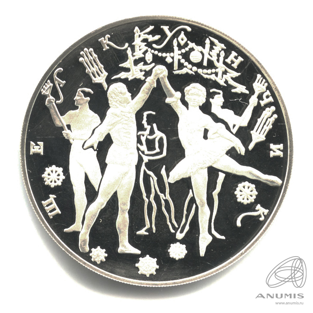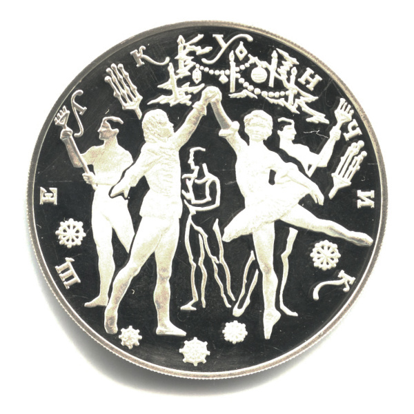 Юбилейная монета: 3 рубля 1996 года «Щелкунчик. Бал». Русский балет. Российская Федерация: Банк России (1992 — 1996). Серебро 900, 34 г, ø 39 мм, Гурт: Рубчатый. Тираж: 25000 шт. Серия: Русский балет.