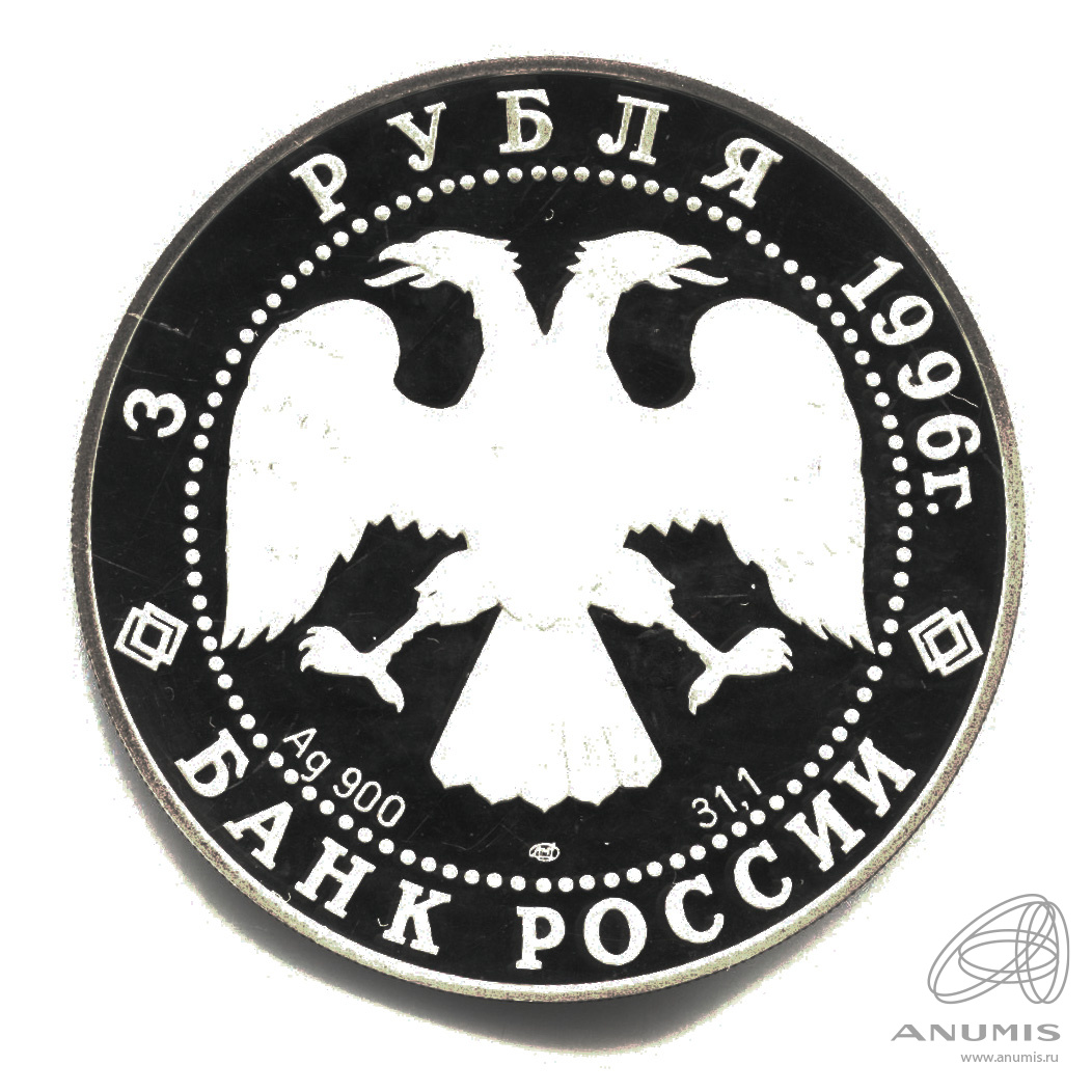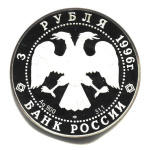изображение двуглавого орла (художник И. Билибин), по кругу надписи: вверху — «3 РУБЛЯ 1996», внизу — «БАНК РОССИИ». В нижней части — обозначение металла, проба сплава, содержание драгоценного металла в чистоте и товарный знак монетного двора.
