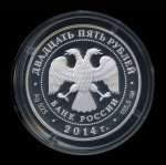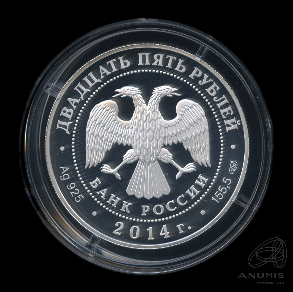 в центре — эмблема Банка России (двуглавый орёл с опущенными крыльями, под ним — надпись полукругом «БАНК РОССИИ»), обрамленная кругом из точек и надписями по кругу — вверху: «ДВАДЦАТЬ ПЯТЬ РУБЛЕЙ», внизу: слева — обозначения драгоценного металла и пробы сплава, в центре — год выпуска «2014 г.», справа — содержание химически чистого металла и товарный знак монетного двора.