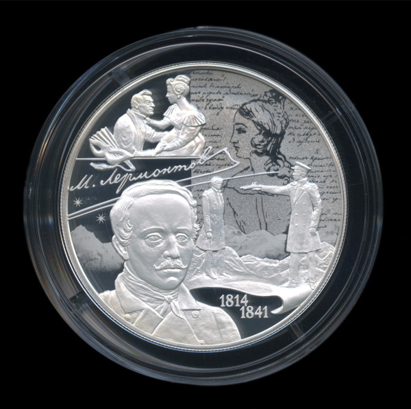 Юбилейная монета: 25 рублей 2014 года «200-летие со дня рождения М.Ю. Лермонтова». 200-летие со дня рождения Михаила Юрьевича Лермонтова. Российская Федерация: Россия современная (1997 — 2020). Монетный двор: Санкт-Петербургский монетный Двор. Серебро 999, 156 г, ø 60 мм, Гурт: Рубчатый. Тираж: 1000 шт. Серия: Историческая серия: 200-летие со дня рождения М.Ю. Лермонтова.
