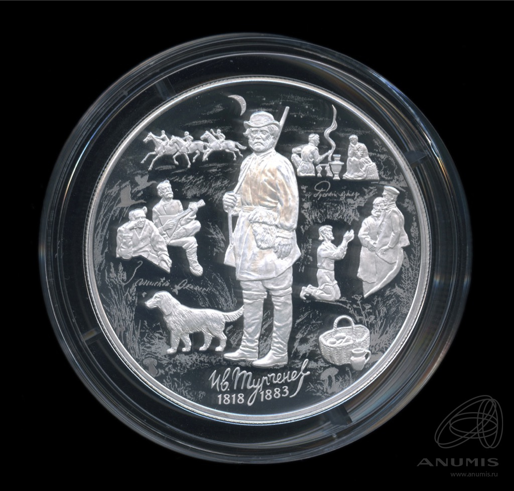 Юбилейная монета: 25 рублей 2018 года «200-летие со дня рождения И.С. Тургенева». 200-летие со дня рождения И.С. Тургенева. Российская Федерация: Россия современная (1997 — 2020). Монетный двор: Санкт-Петербургский монетный Двор. Серебро 925, 169 г, ø 60 мм, Гурт: Рубчатый. Тираж: 1000 шт. Серия: 200-летие со дня рождения И.С. Тургенева.