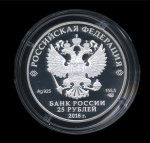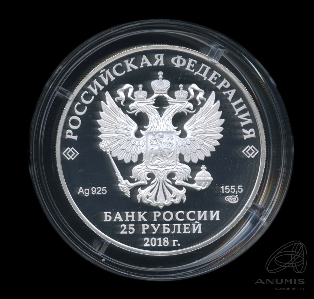 на зеркальном поле диска — рельефное изображение Государственного герба Российской Федерации, над ним вдоль канта — надпись полукругом: «РОССИЙСКАЯ ФЕДЕРАЦИЯ», обрамленная с обеих сторон сдвоенными ромбами, внизу под гербом: слева — обозначения драгоценного металла и пробы сплава, справа — содержание химически чистого металла и товарный знак монетного двора, внизу в центре — надпись в три строки: «БАНК РОССИИ», номинал монеты: «25 РУБЛЕЙ», год выпуска: «2018 г.».