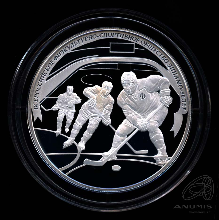 Юбилейная монета: 25 рублей 2013 года «Хоккей». 90-летие Всероссийского физкультурно-спортивного общества «Динамо». Российская Федерация: Россия современная (1997 — 2020). Монетный двор: Санкт-Петербургский монетный Двор. Серебро 925, 156 г, ø 60 мм, Гурт: Рубчатый. Тираж: 2000 шт. Серия: 90-летие Всероссийского физкультурно-спортивного общества «Динамо».