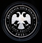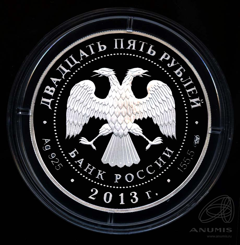 в центре — эмблема Банка России (двуглавый орёл с опущенными крыльями, под ним — надпись полукругом «БАНК РОССИИ»), обрамленная кругом из точек и надписями по кругу — вверху: «ДВАДЦАТЬ ПЯТЬ РУБЛЕЙ», внизу: слева — обозначения драгоценного металла и пробы сплава, в центре — дата выпуска «2013 г.», справа — содержание химически чистого металла и товарный знак монетного двора.