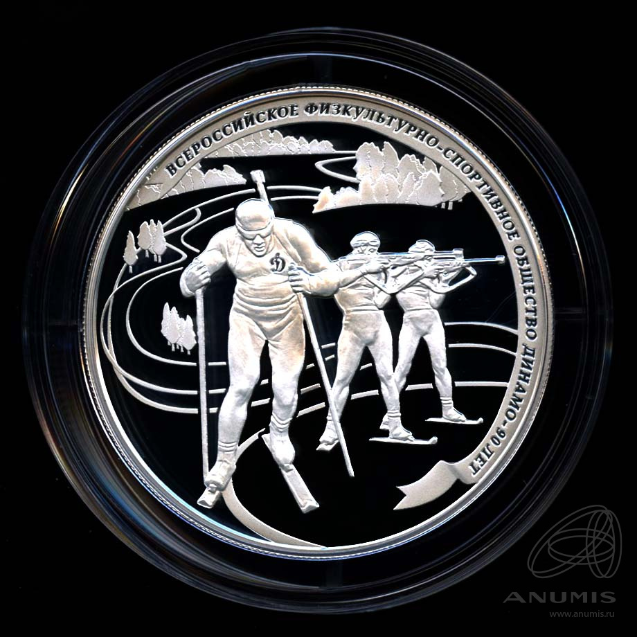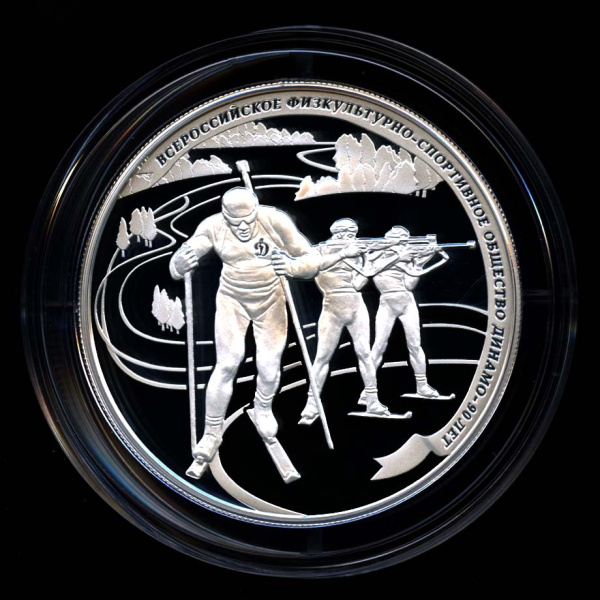 Юбилейная монета: 25 рублей 2013 года «Биатлон». 90-летие Всероссийского физкультурно-спортивного общества «Динамо». Российская Федерация: Россия современная (1997 — 2020). Монетный двор: Московский монетный двор, г. Москва. Серебро 925, 156 г, ø 60 мм, Гурт: Рубчатый. Тираж: 2000 шт. Серия: 90-летие Всероссийского физкультурно-спортивного общества «Динамо».
