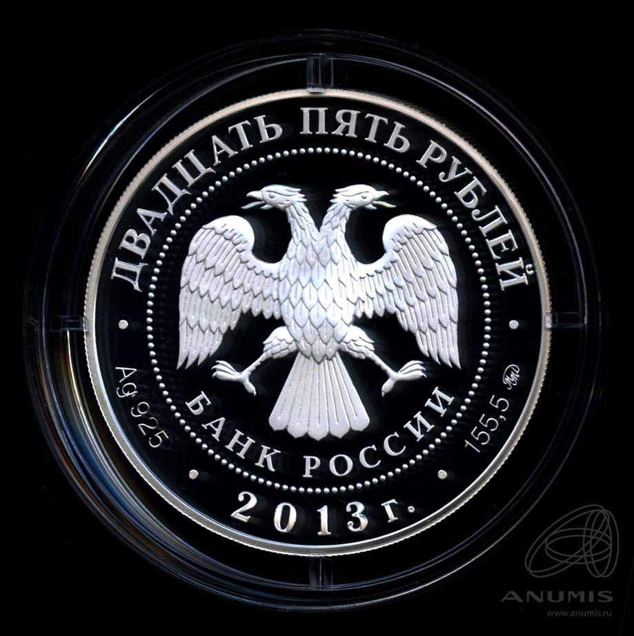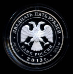 в центре — эмблема Банка России (двуглавый орёл с опущенными крыльями, под ним — надпись полукругом «БАНК РОССИИ»), обрамленная кругом из точек и надписями по кругу — вверху: «ДВАДЦАТЬ ПЯТЬ РУБЛЕЙ», внизу: слева — обозначения драгоценного металла и пробы сплава, в центре — дата выпуска «2013 г.», справа — содержание химически чистого металла и товарный знак монетного двора.